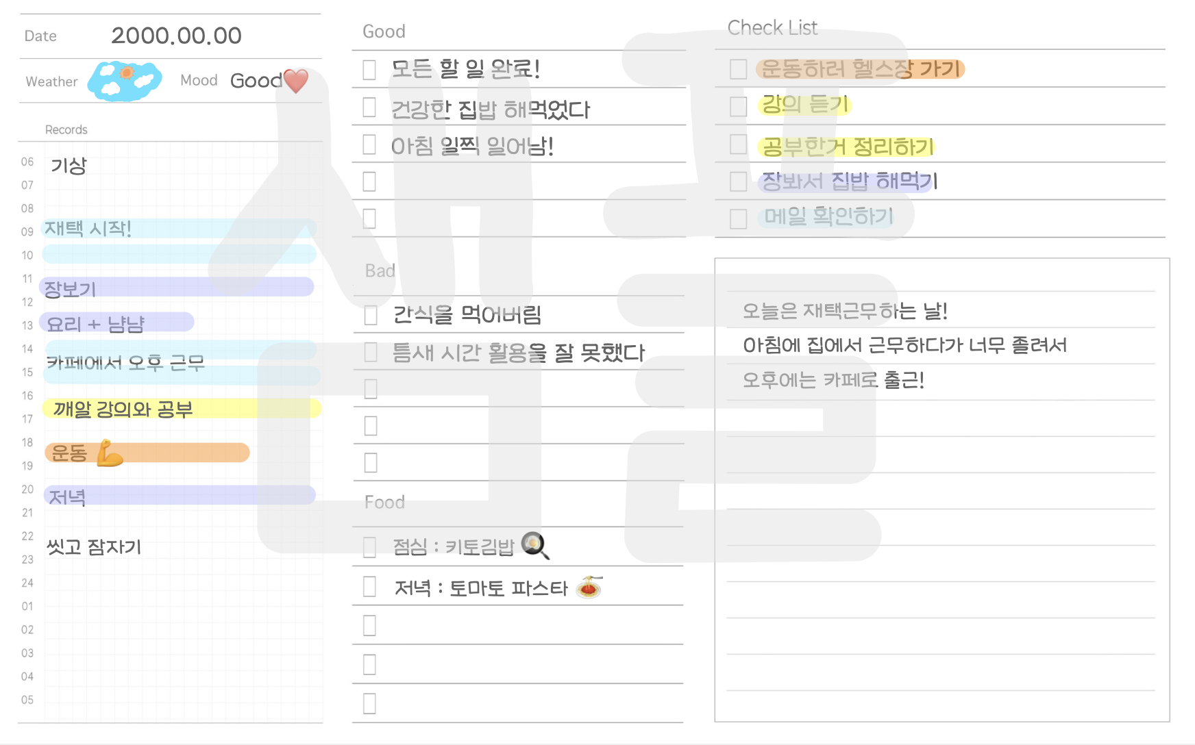 위에 큰 칸 두개는 목표 / 할 일 등을 메모할 수 있게 구성하였습니다.