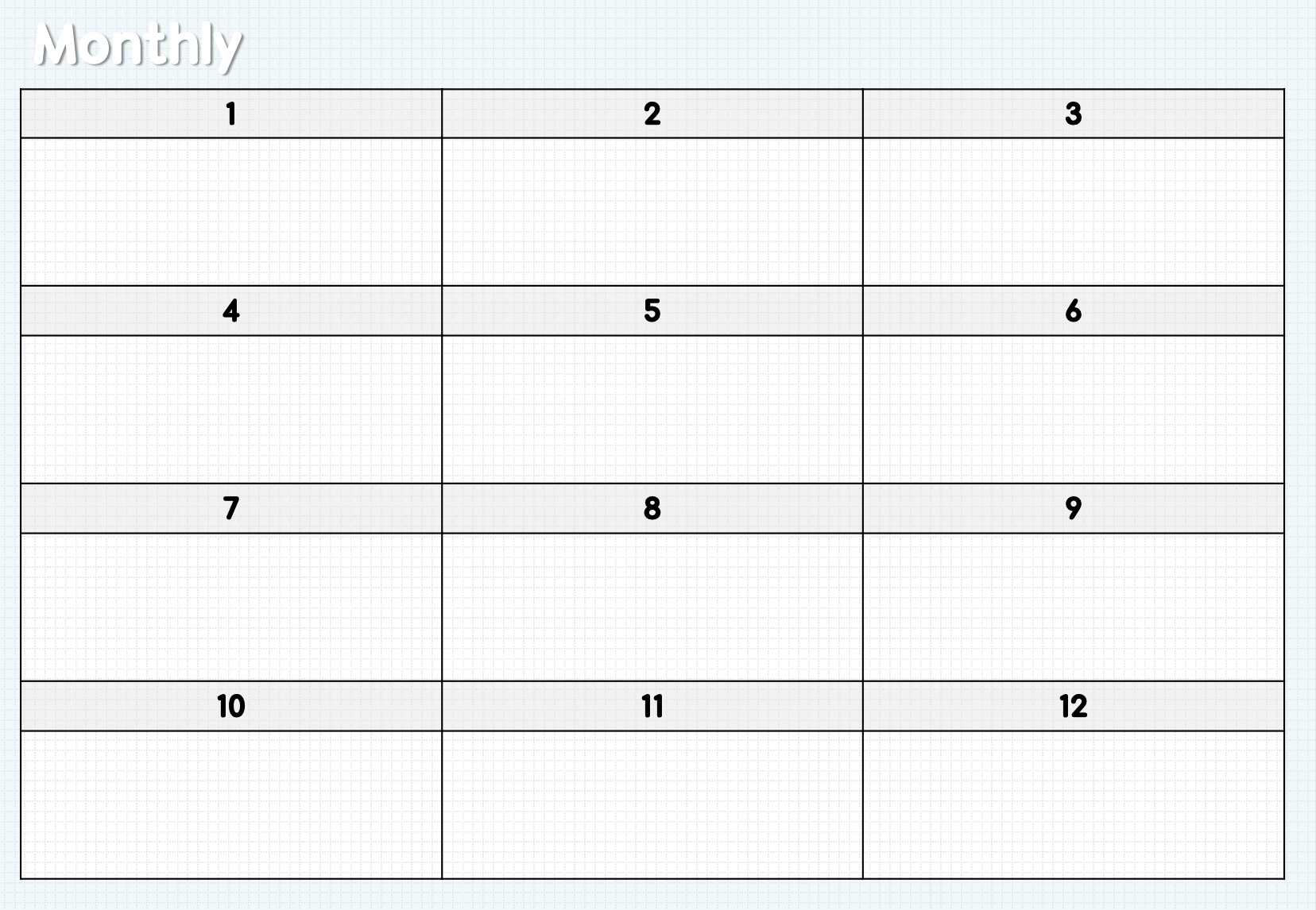 1월~12월까지 매달 만년형으로 이용할 수 있는 월간 페이지입니다.