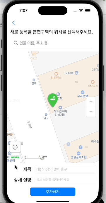 초기 기획은 홈 화면에서 추가 버튼을 누르면 같은 화면 내에서 마커 추가하는 것이었지만,