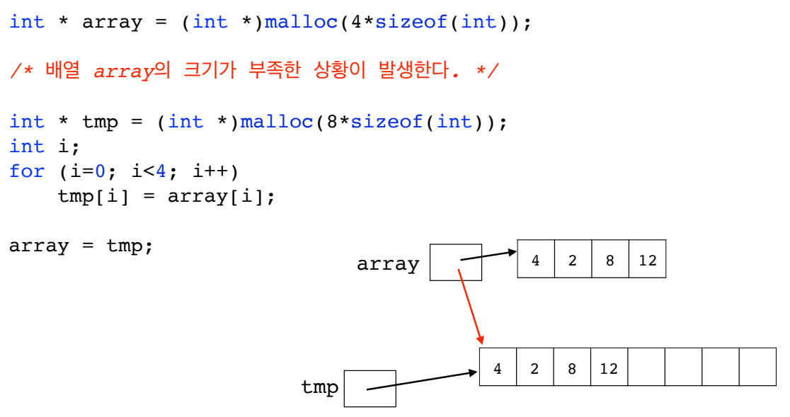 동적으로 할당된 배열은 공간이 부족할 경우 더 큰 배열을 할당하여 사용할 수 있다.
