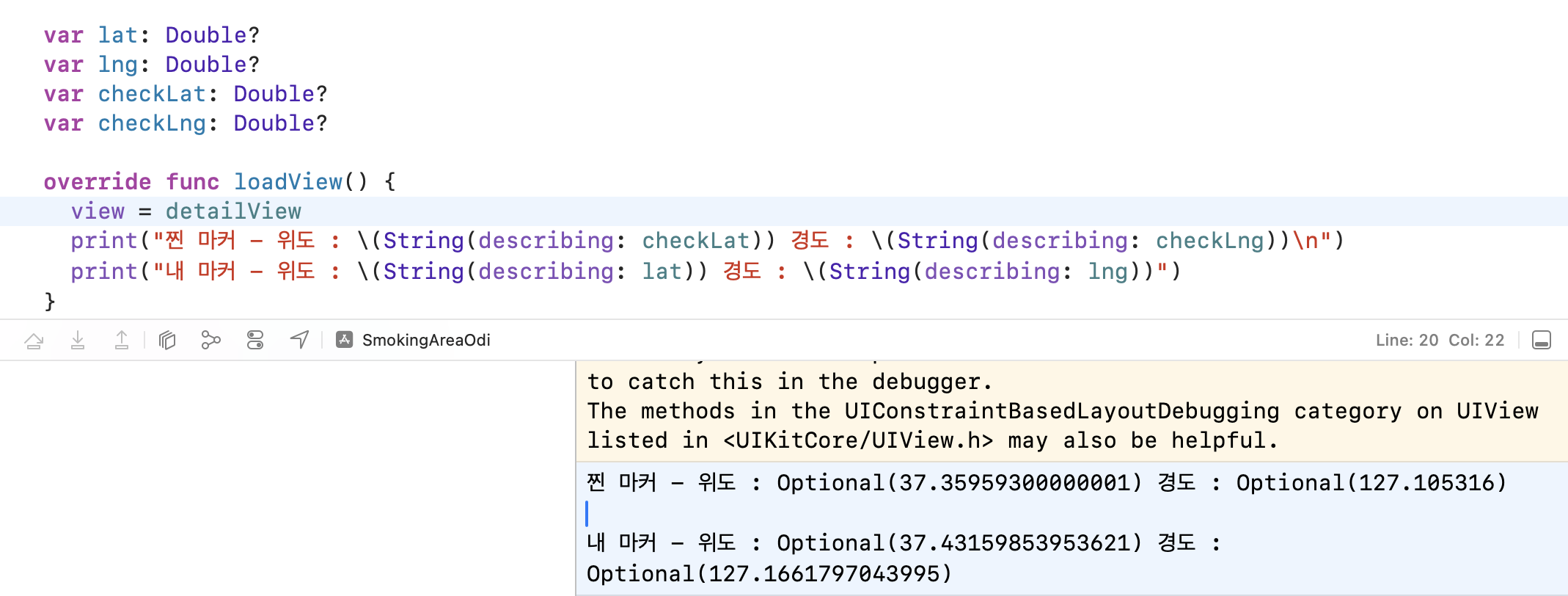 print("찐 마커 - 위도 : \(String(describing: checkLat)) 경도 : \(String(describing: checkLng))\n")